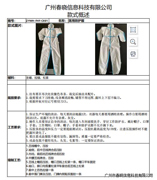 送上防护服生产技术标准流程一套!